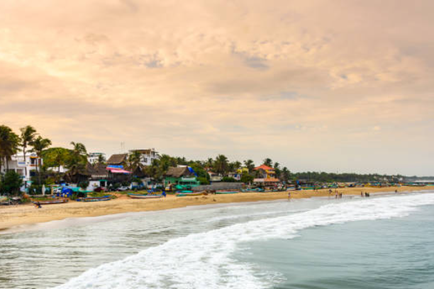 On one side of the beach, the Chunnambar River meets the sea, creating a gentle estuary where children can wade with their feet in the sand while watching boats pass by.